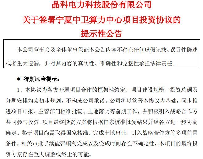 此外,鉴于该“宁夏中卫1GW算力中心项目”尚需取得国家核准、完成土地出让、引入战略合作方等多项前置条件,相关审批手续能否顺利完成以及完成时间存在不确定性,本项目的最终投资方案存在重大调整或终止的可能。